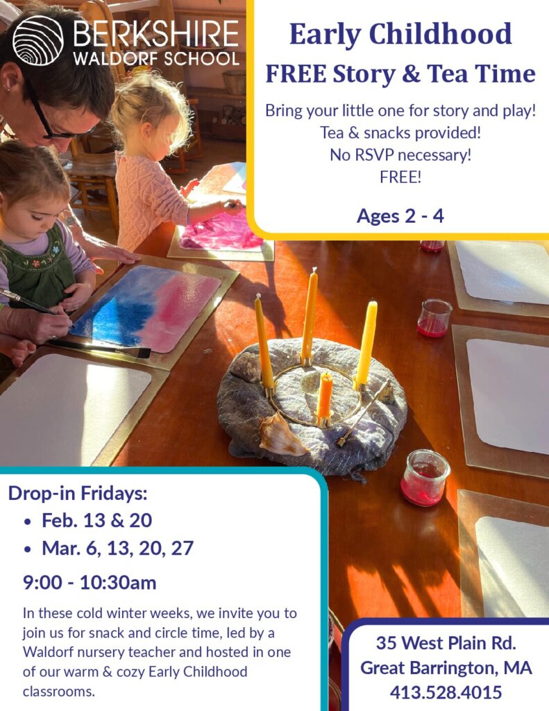 Our Valentine to parents/caregivers with little ones (ages 2-4)! Starting Friday, February 13, join us in the Betty Szold Krainis Early Childhood Building at Berkshire Waldorf School for a free drop-in play time with songs, stories and snacks, hosted by BWS Nursery teachers Ms. Beth & Ms. Soheireh. All to get you through to Spring!